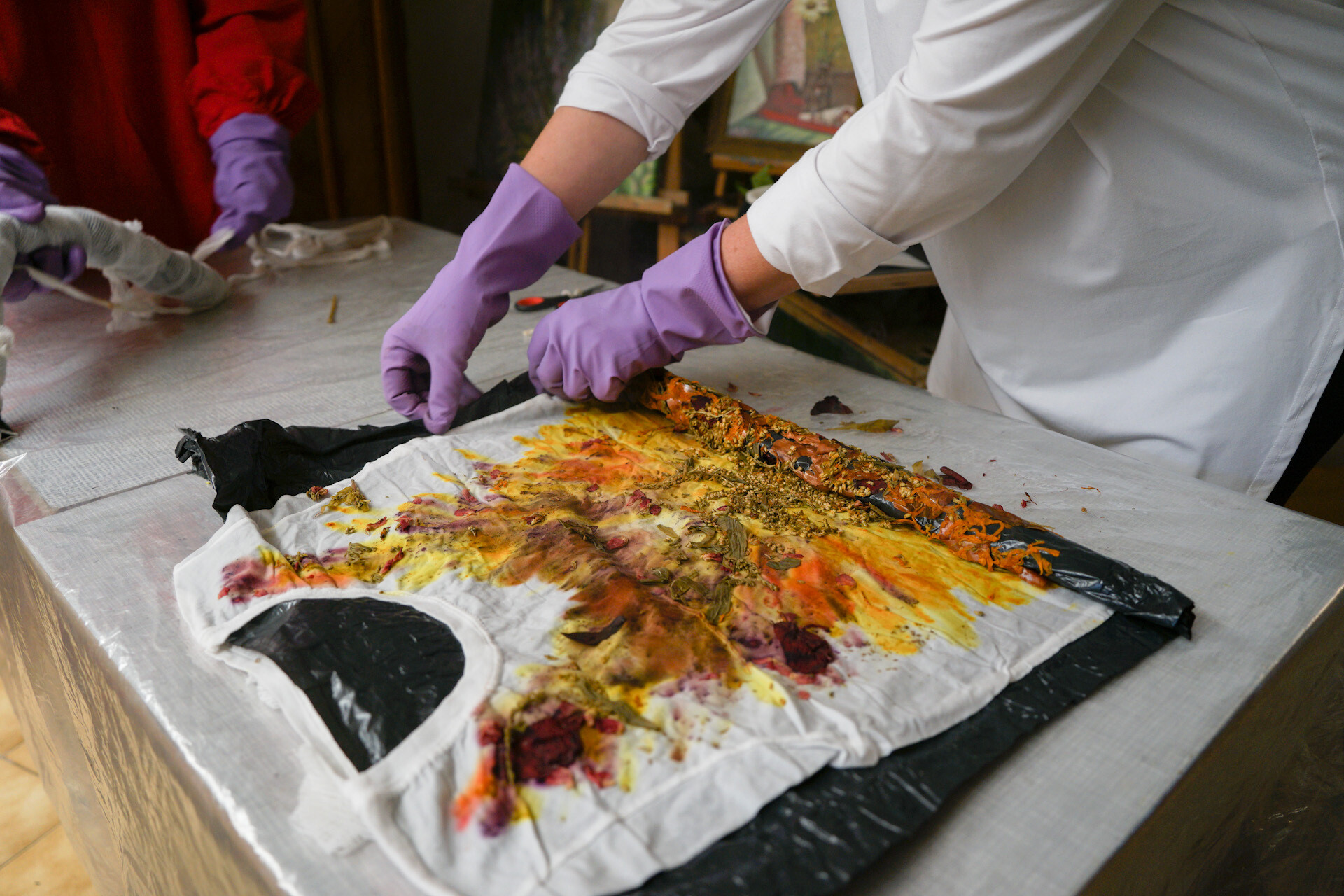 Na warsztatach pracujemy na przygotowanych przeze mnie tkaninach, żeby spokojnie przejść przez cały proces. Umiejętności, które zdobędziesz, pozwolą Ci później samodzielnie farbować własne ubrania w domu.