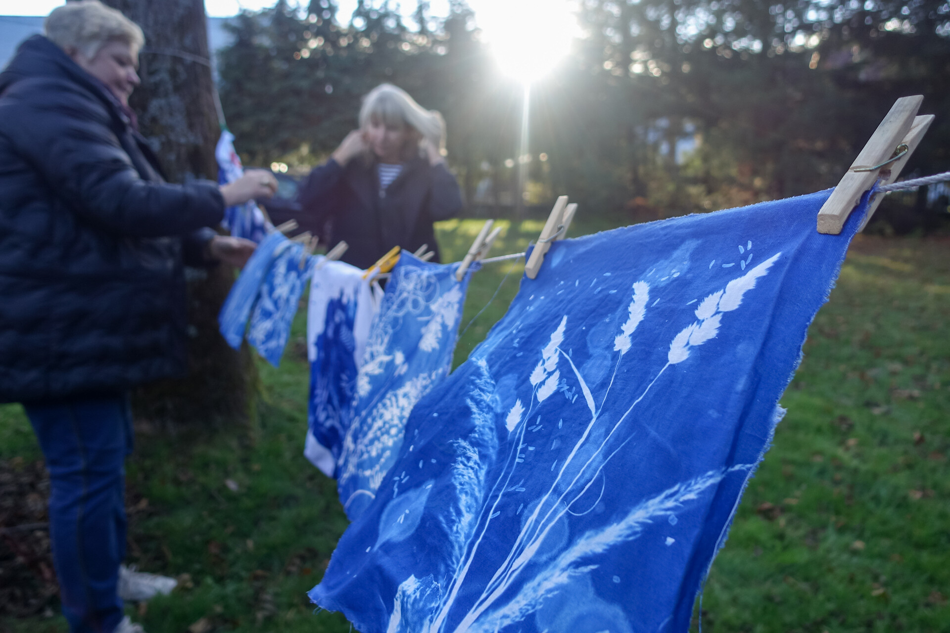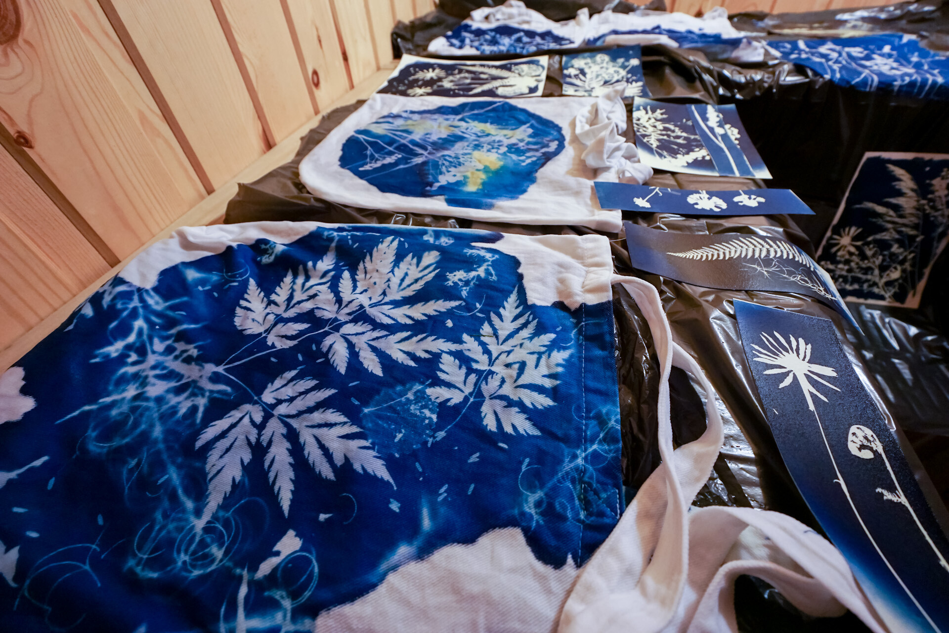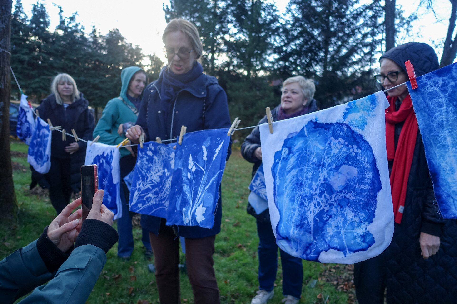 Był czas na próby, eksperymenty, rozmowy i dzielenie się doświadczeniem. W miarę jak błękitne obrazy zaczynały pojawiać się na papierze i tkaninie, rosła w nas radość i poczucie twórczej kreacji. Zwieńczeniem warsztatów było stworzenie osobistego, niepowtarzalnego wzoru na torbie, małego dzieła sztuki, które można ze sobą zabrać i używać na co dzień.