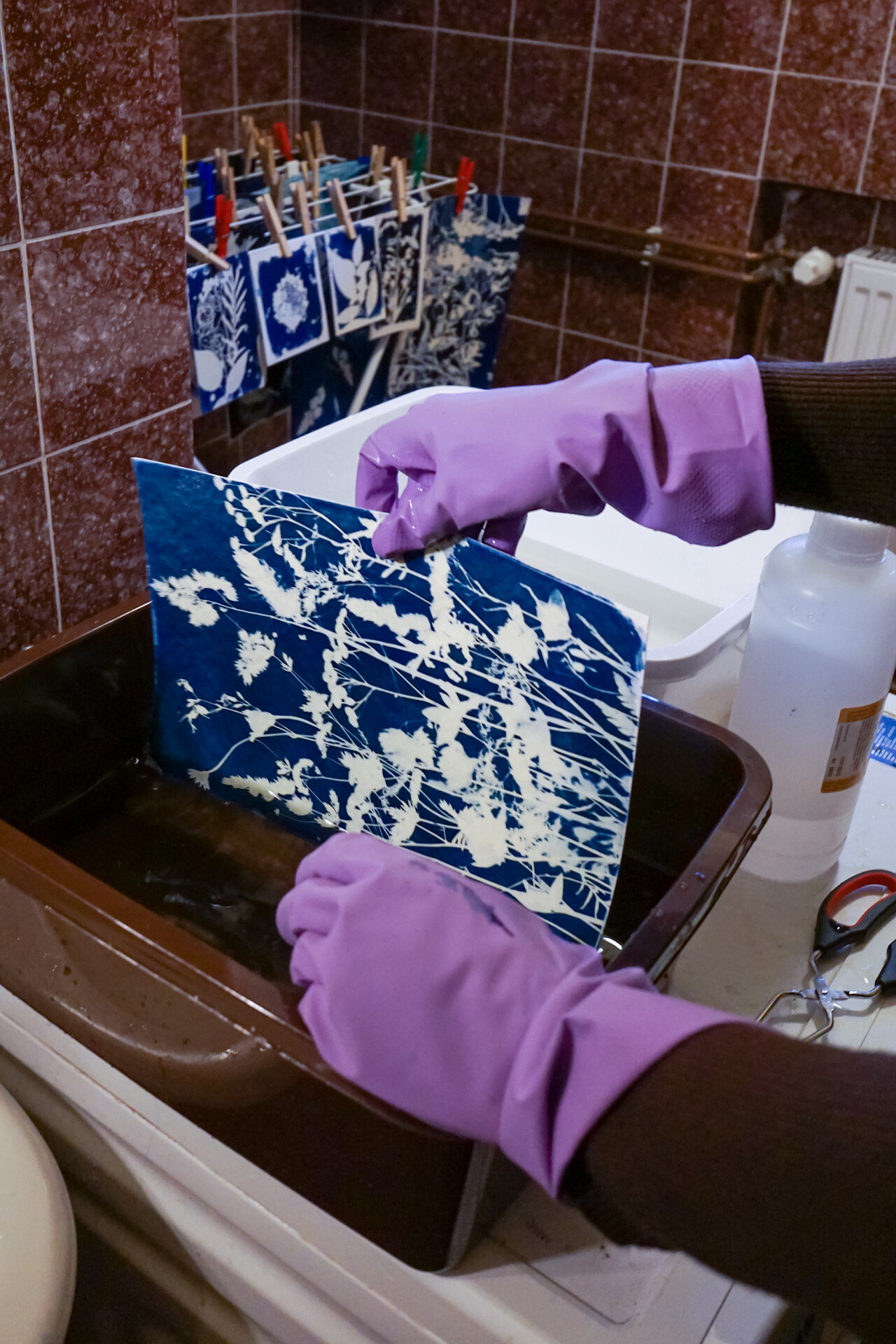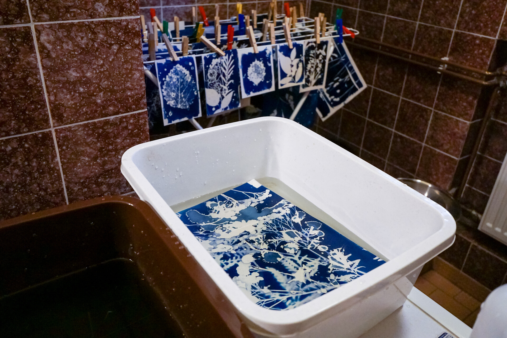Nasza Niebieska Alchemia miała charakter wyjątkowo warsztatowy - od pierwszego kontaktu z materiałami, aż po tworzenie gotowych, trwałych prac. Uczestniczki uczyły się cyjanotypii od samych podstaw: od przygotowania odczynników, poprzez nakładanie emulsji światłoczułej na papier i tkaninę, aż po proces naświetlania - zarówno w warunkach domowych, jak i przy użyciu naturalnego światła słonecznego.