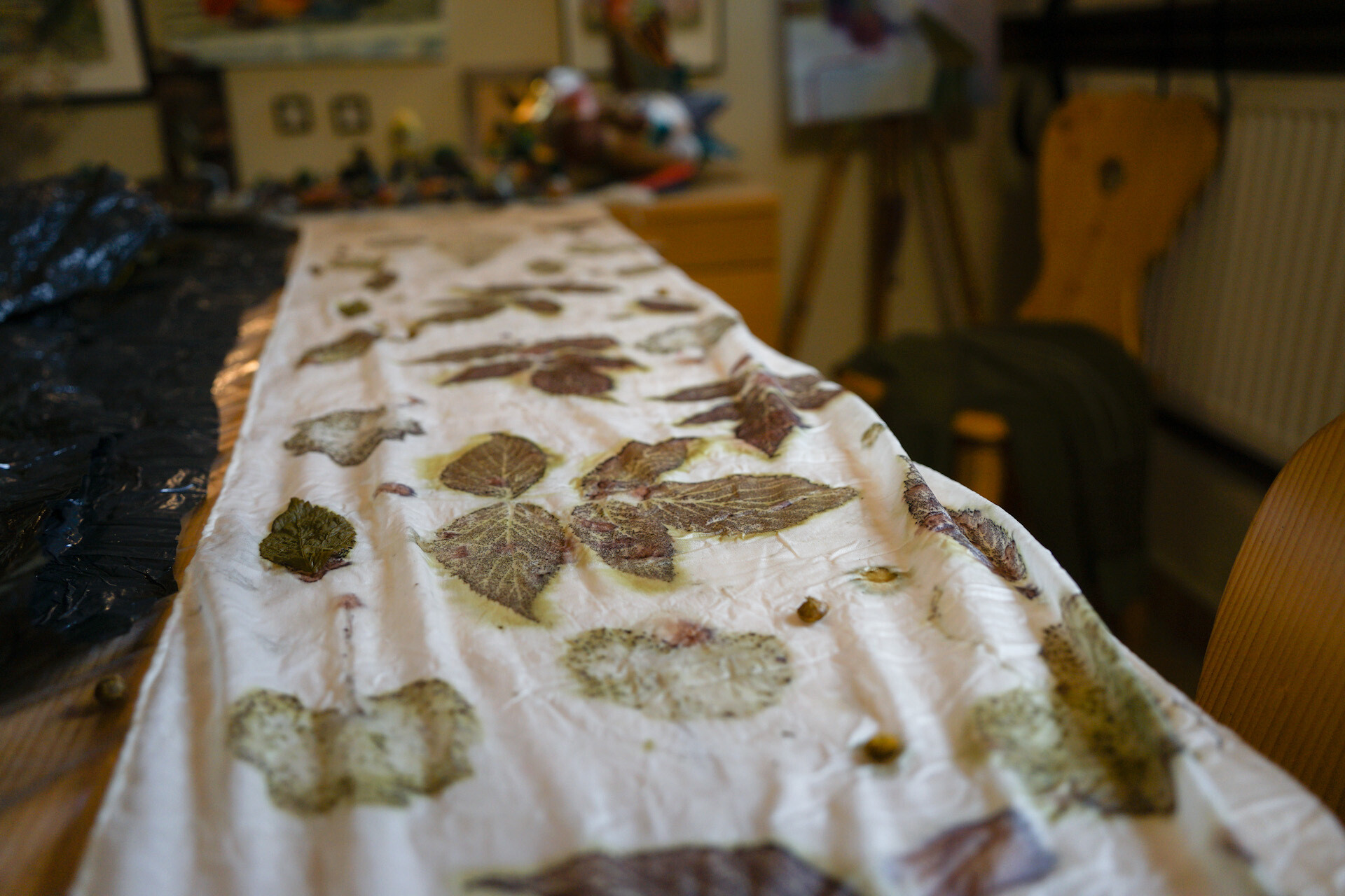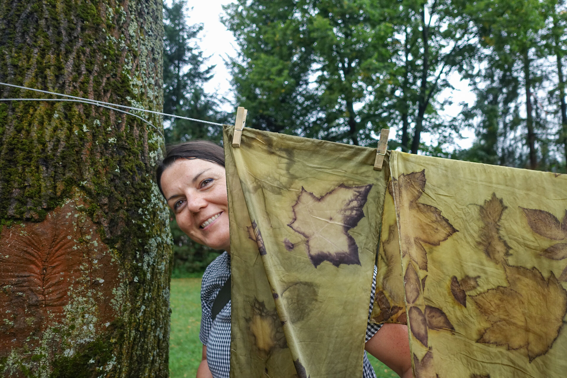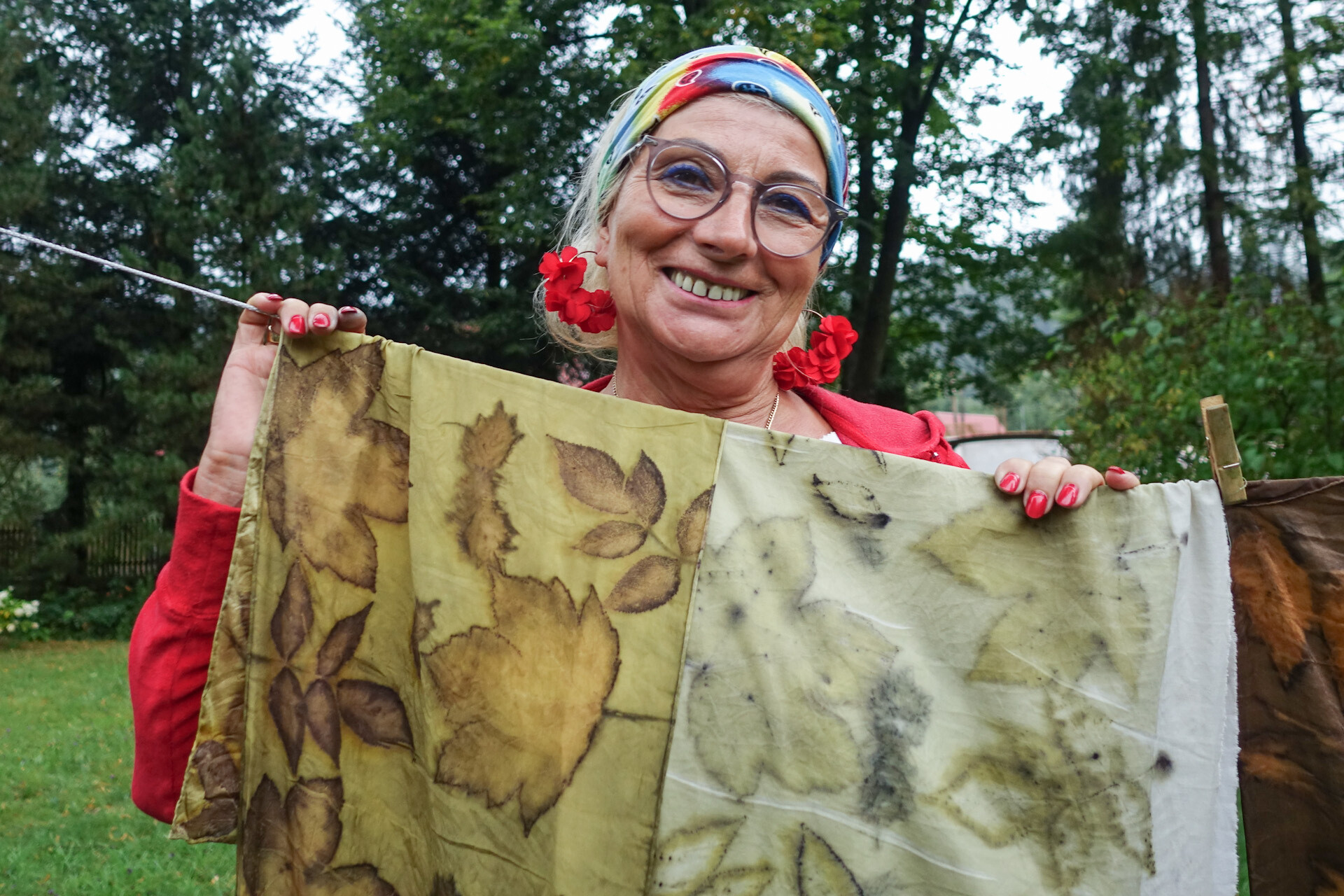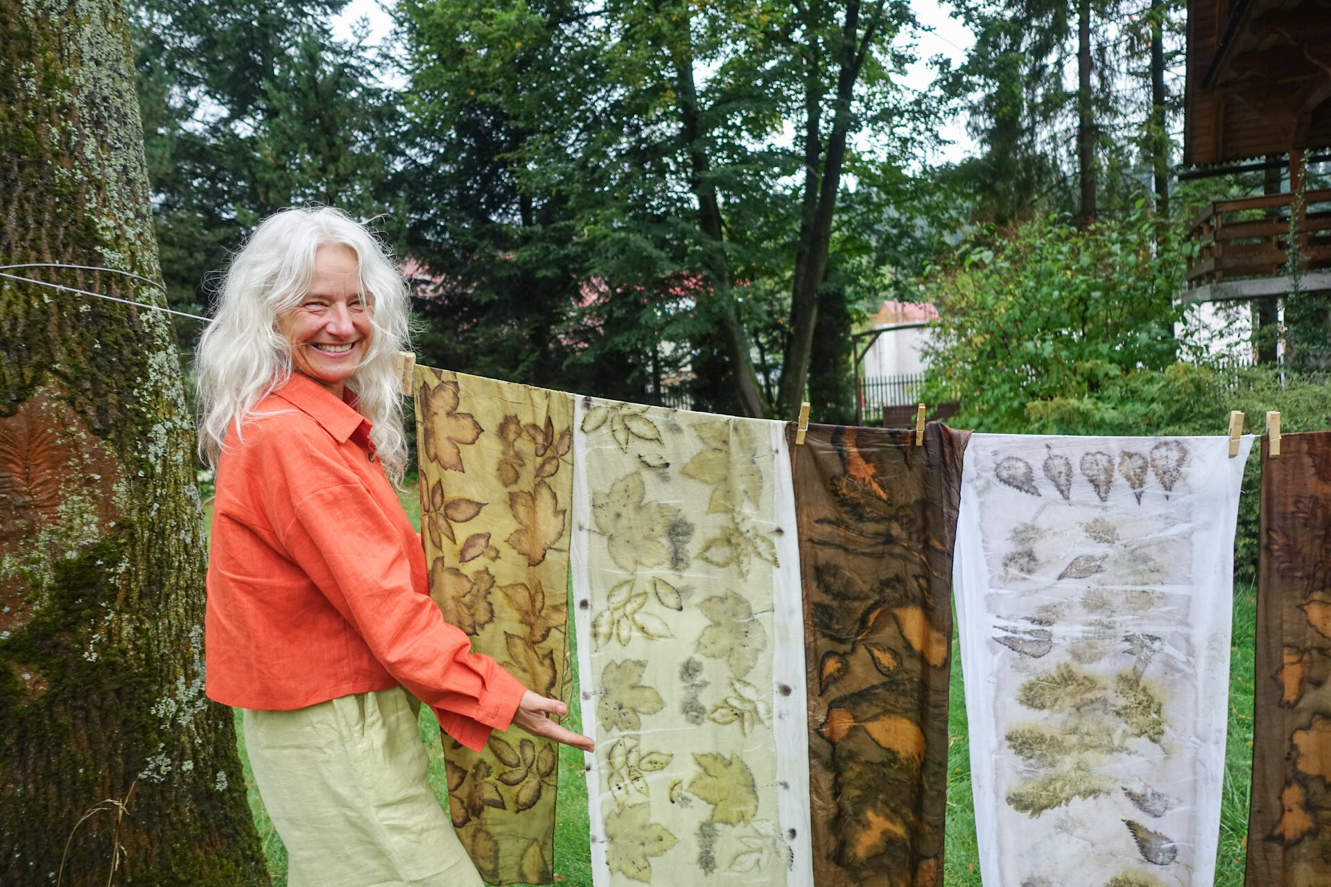 Sam ecoprinting to dialog twórcy z roślinami. Każdy wnosi coś od siebie. Żeby ta synergia mogła zaistnieć, potrzebna jest odpowiednia przestrzeń – spokojna, inspirująca. Dom warsztatowy Fundacji Pod Jasieniami to idealne miejsce, które sprzyja tworzeniu i byciu blisko natury. Ważny jest też czas. Widzę, jak ogromne znaczenie ma to, że warsztaty trwają dwa dni. Pierwszy dzień to poznanie technik, a drugi wykorzystanie zdobytej wiedzy i doświadczenia do projektów końcowych. I wtedy właśnie dzieje się magia.