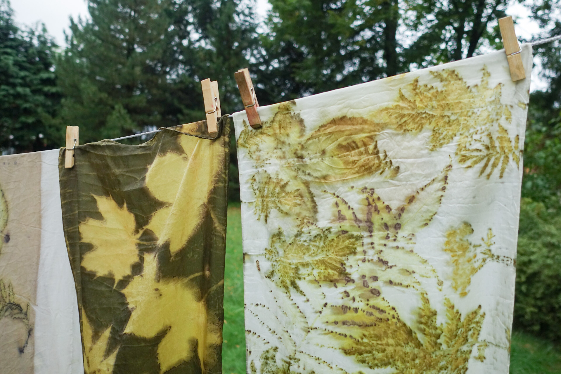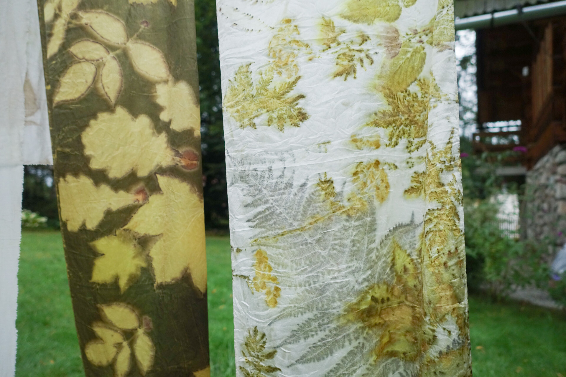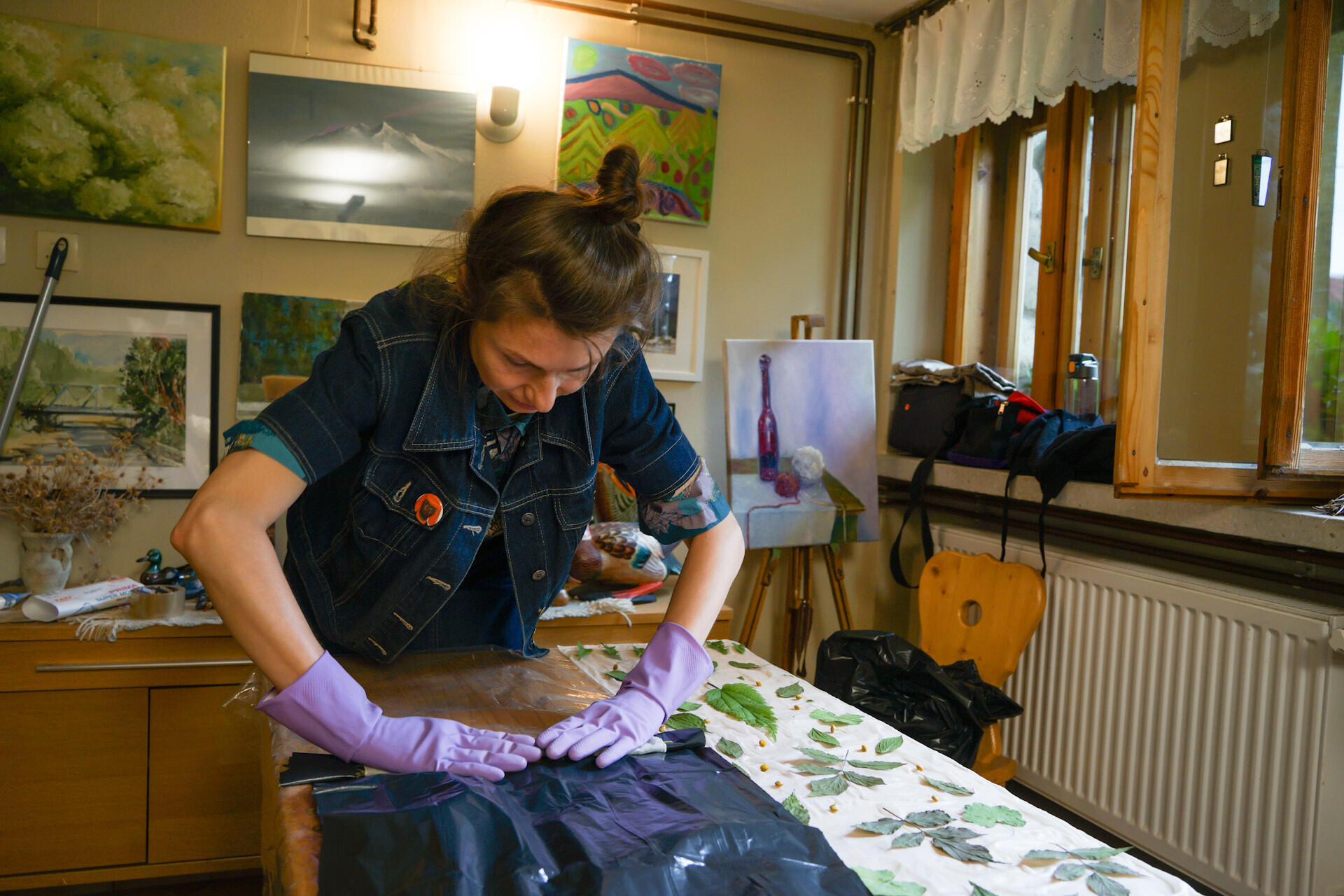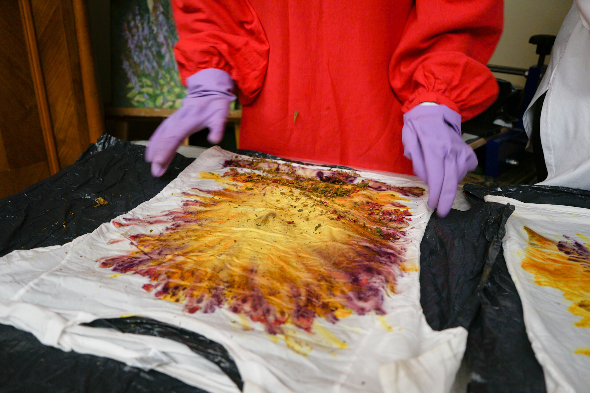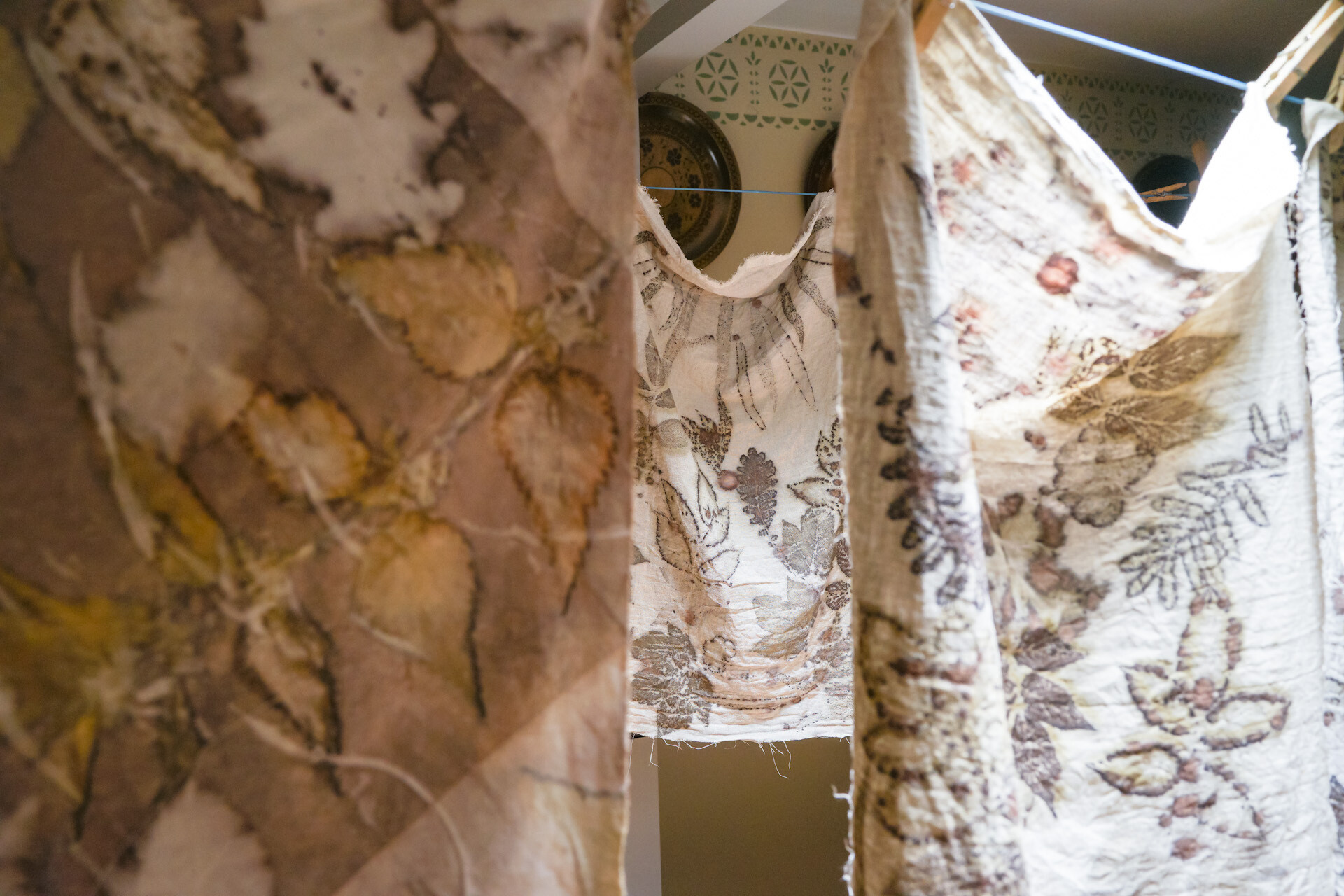 Sam ecoprinting to dialog twórcy z roślinami. Każdy wnosi coś od siebie. Żeby ta synergia mogła zaistnieć, potrzebna jest odpowiednia przestrzeń – spokojna, inspirująca. Dom warsztatowy Fundacji Pod Jasieniami to idealne miejsce, które sprzyja tworzeniu i byciu blisko natury. Ważny jest też czas. Widzę, jak ogromne znaczenie ma to, że warsztaty trwają dwa dni. Pierwszy dzień to poznanie technik, a drugi wykorzystanie zdobytej wiedzy i doświadczenia do projektów końcowych. I wtedy właśnie dzieje się magia.