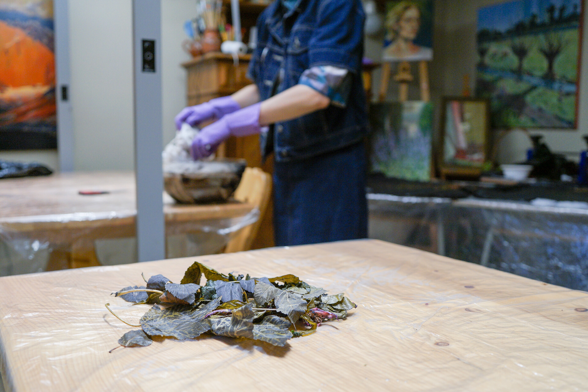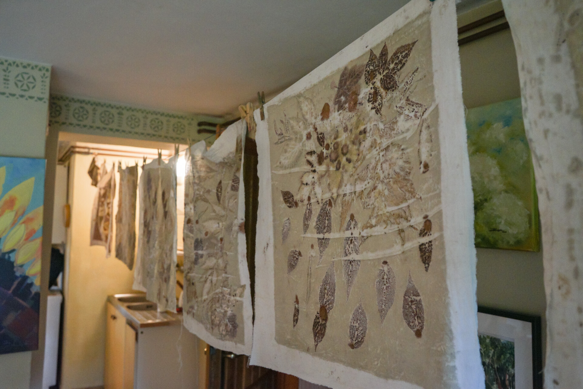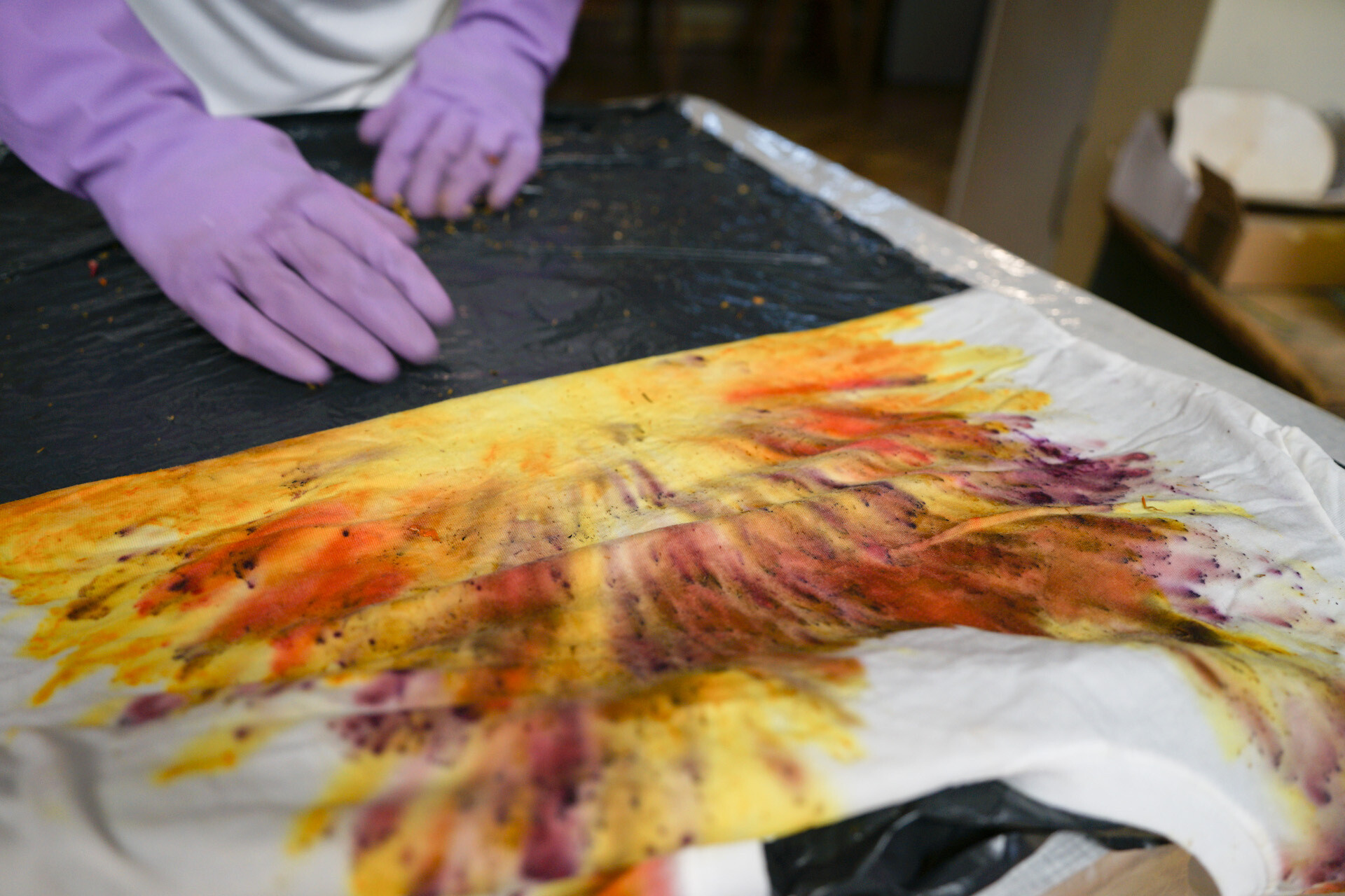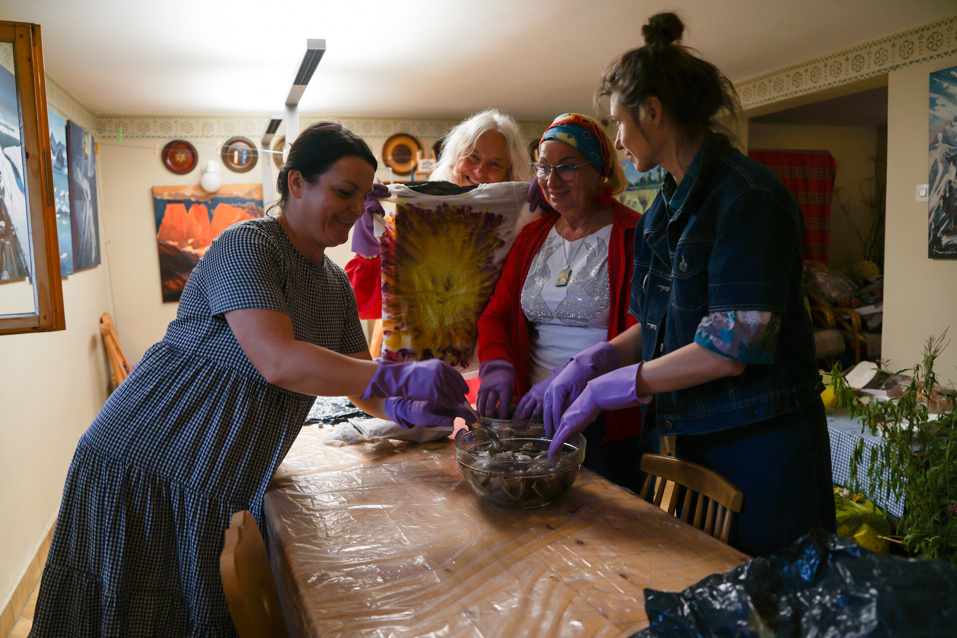 Sam ecoprinting to dialog twórcy z roślinami. Każdy wnosi coś od siebie. Żeby ta synergia mogła zaistnieć, potrzebna jest odpowiednia przestrzeń – spokojna, inspirująca. Dom warsztatowy Fundacji Pod Jasieniami to idealne miejsce, które sprzyja tworzeniu i byciu blisko natury. Ważny jest też czas. Widzę, jak ogromne znaczenie ma to, że warsztaty trwają dwa dni. Pierwszy dzień to poznanie technik, a drugi wykorzystanie zdobytej wiedzy i doświadczenia do projektów końcowych. I wtedy właśnie dzieje się magia.