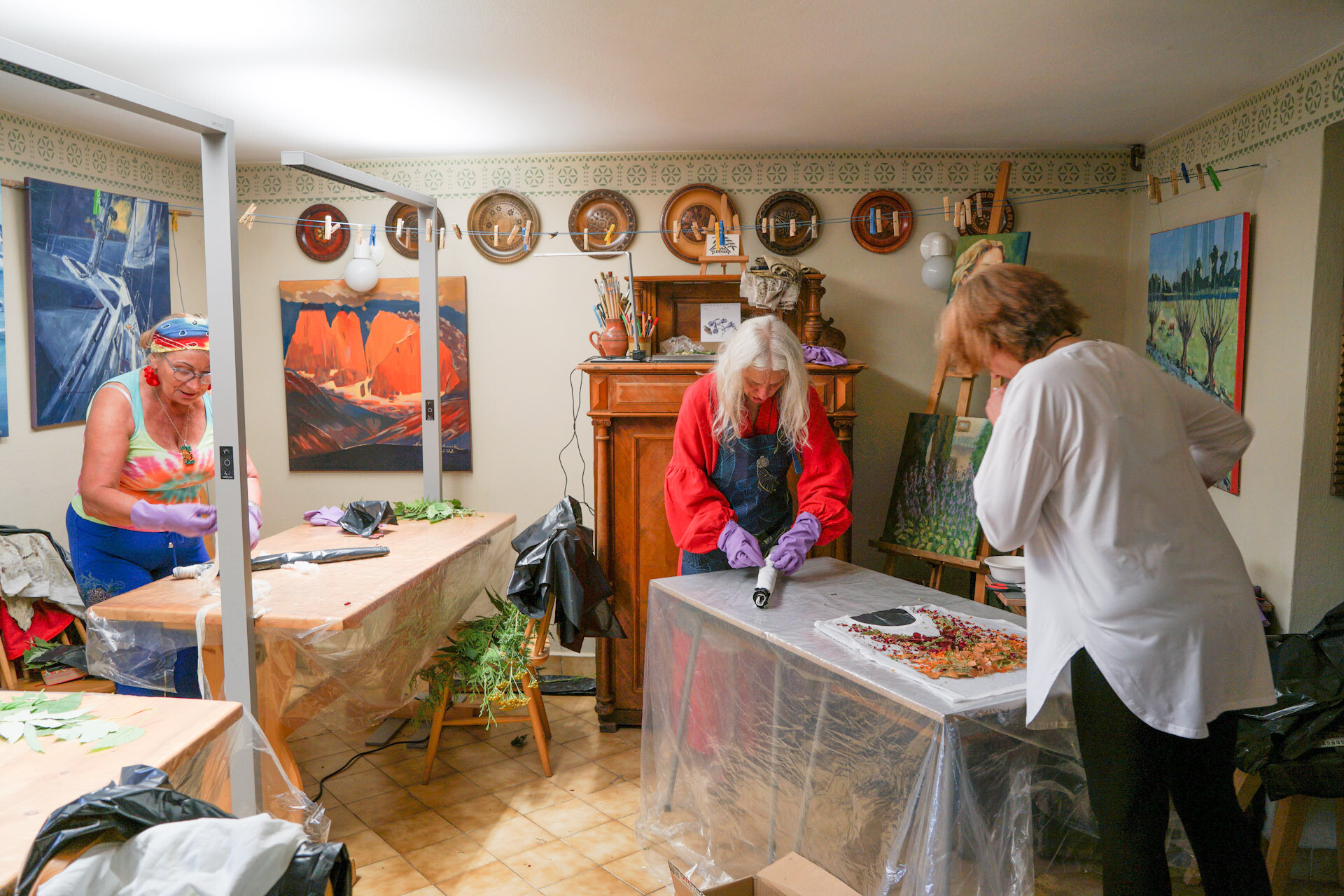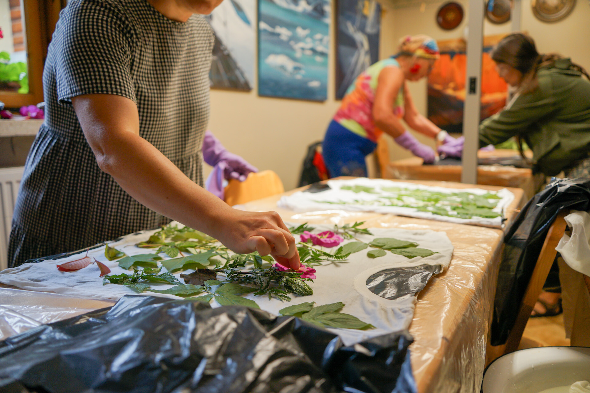 Podczas tych warsztatów ecoprintingu (drukowania roślinami na tkaninach) uczestniczki eksperymentowały z różnymi materiałami – od bawełny, przez len, aż po jedwab. W programie znalazły się aż trzy różne techniki ecoprintu, dzięki czemu każda osoba mogła odnaleźć własny sposób na twórcze wyrażenie siebie poprzez naturę i materiał.